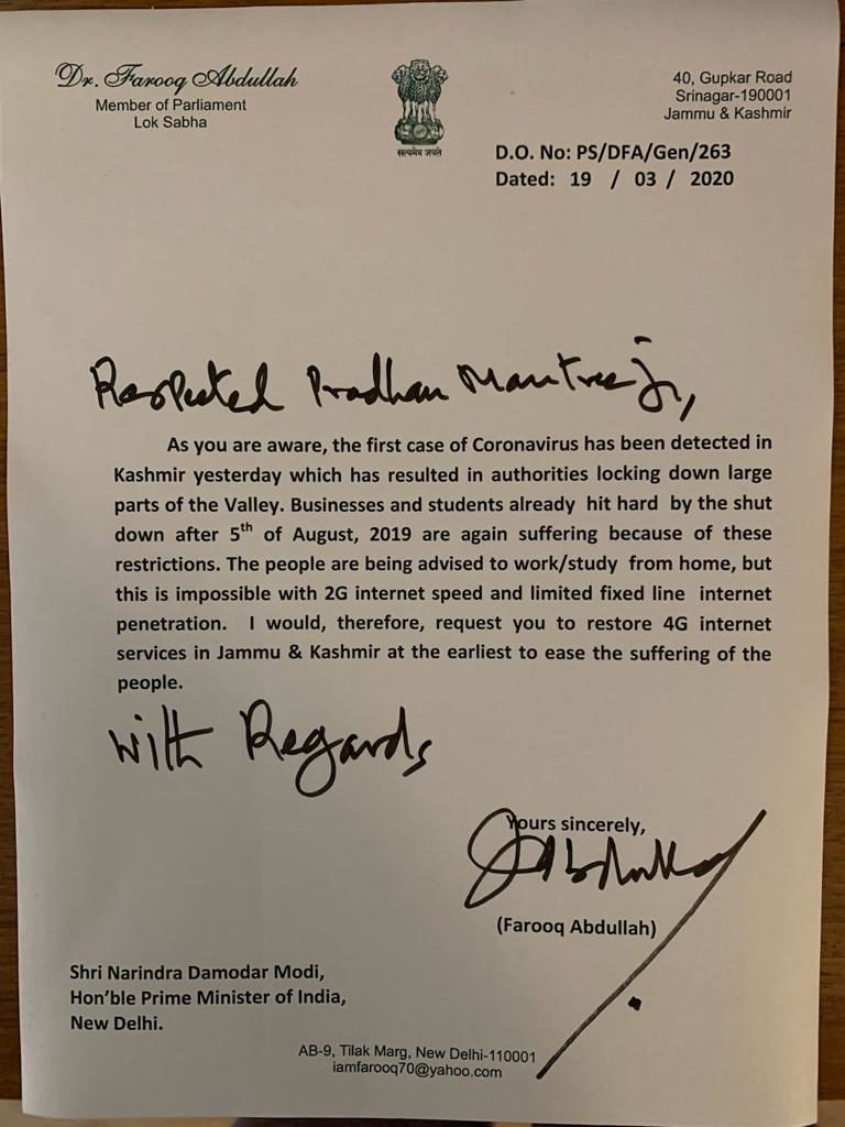 Meanwhile, National Conference president and parliamentarian wrote to Prime Minister Narendra Modi, requesting him to restore 4G Internet service on mobile networks in Kashmir amidst the growing Covid-19 threat.