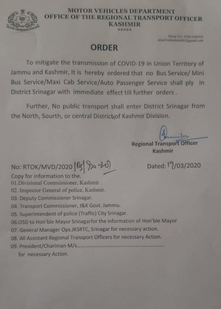 Srinagar, March 19: In an effort to retard the spread of coronavirus, the Administration on Thursday banned the movement of mini buses, cabs and auto rickshaws in Srinagar district. Public transport from other districts was also barred from entering Srinagar district.