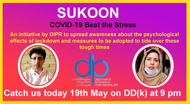 JAMMU, MAY 19:- In order to spread awareness about the psychological impact of lockdown and measures to be adopted to overcome them, the Department of Information and Public Relations today started an initiative ‘SUKOON’ – COVID 19 Beat the Stress. The programme will be telecast on DD (K) every Tuesday at 9.00 pm during which psychiatrists and social scientists will give tele sessions on psychological health and how to keep the mind anxiety free.