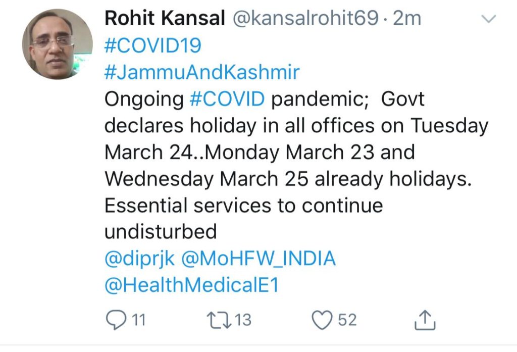Shri Rohit Kansal has acknowledged the news through a tweet where he says 24th has been declared a holiday, how ever essential services will continue with out any disturbances.
