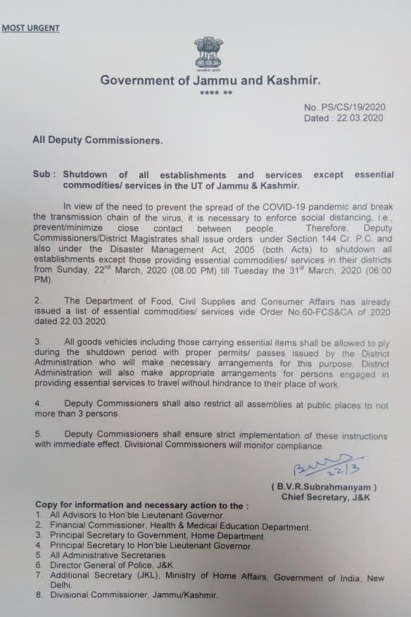 J & K Jammu And Kashmir To Go Into Virtual Lock Down From 23rd To 31st March By Paigaam News - March 22, 2020 517 Facebook Twitter Google+ Pinterest WhatsApp