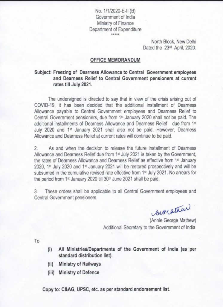 The additional instalments of DA and Dearness Relief due from July 1, 2020 and January 1, 2021 would also not be paid.