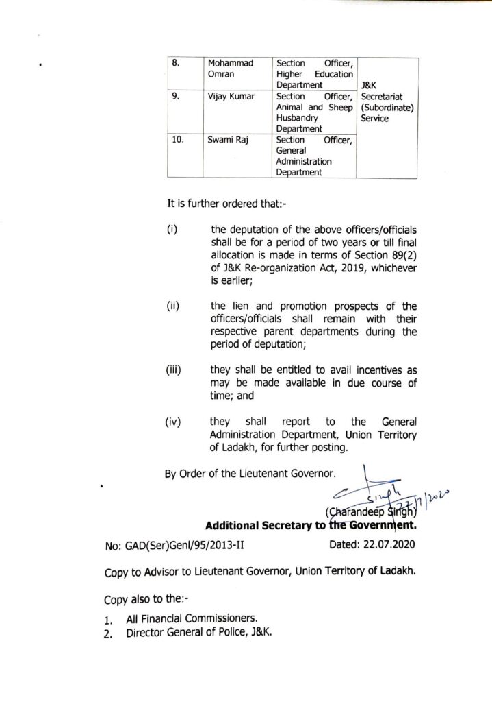J & K DEPUTATION OF OFFICERS/OFFICIALS TO THE UNION TERRITORY OF LADKH By Paigaam News - July 23, 2020 434 Facebook Twitter Google+ Pinterest WhatsApp