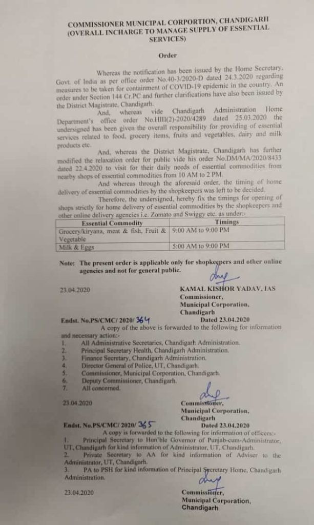 Tricity Chandigarh: New timings for home delivery shops, online agencies By Paigaam News - April 24, 2020 536 Facebook Twitter Google+ Pinterest WhatsApp