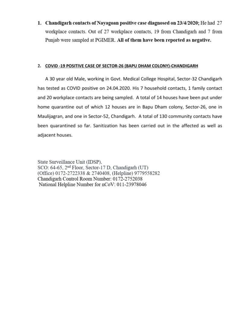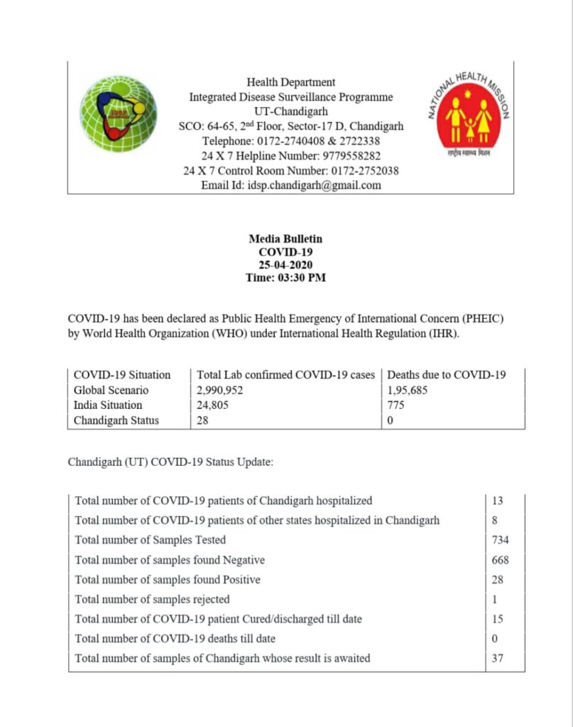 Tricity COVID 19: Media Bulletin by UT Chandigarh By Paigaam News - April 25, 2020 490 Facebook Twitter Google+ Pinterest WhatsApp