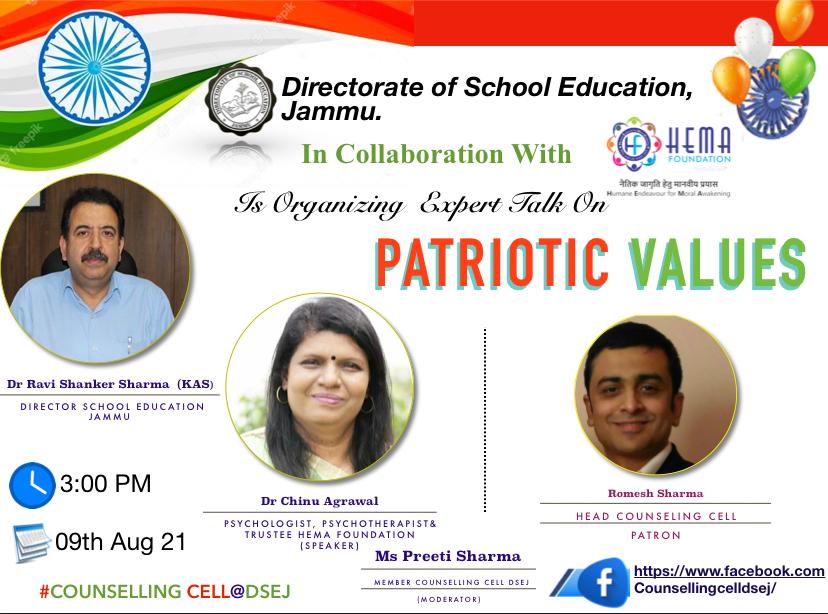 Jammu: Counselling Cell Directorate of School Education Jammu in collaboration with Hema Foundation organized an expert talk on the topic – ‘Imbibing Patriotic Values Among Youth’ by one of the renowned psychologists of India Dr. Chinu Aggarwal to commemorate the upcoming 75th Independence Day Celebrations.