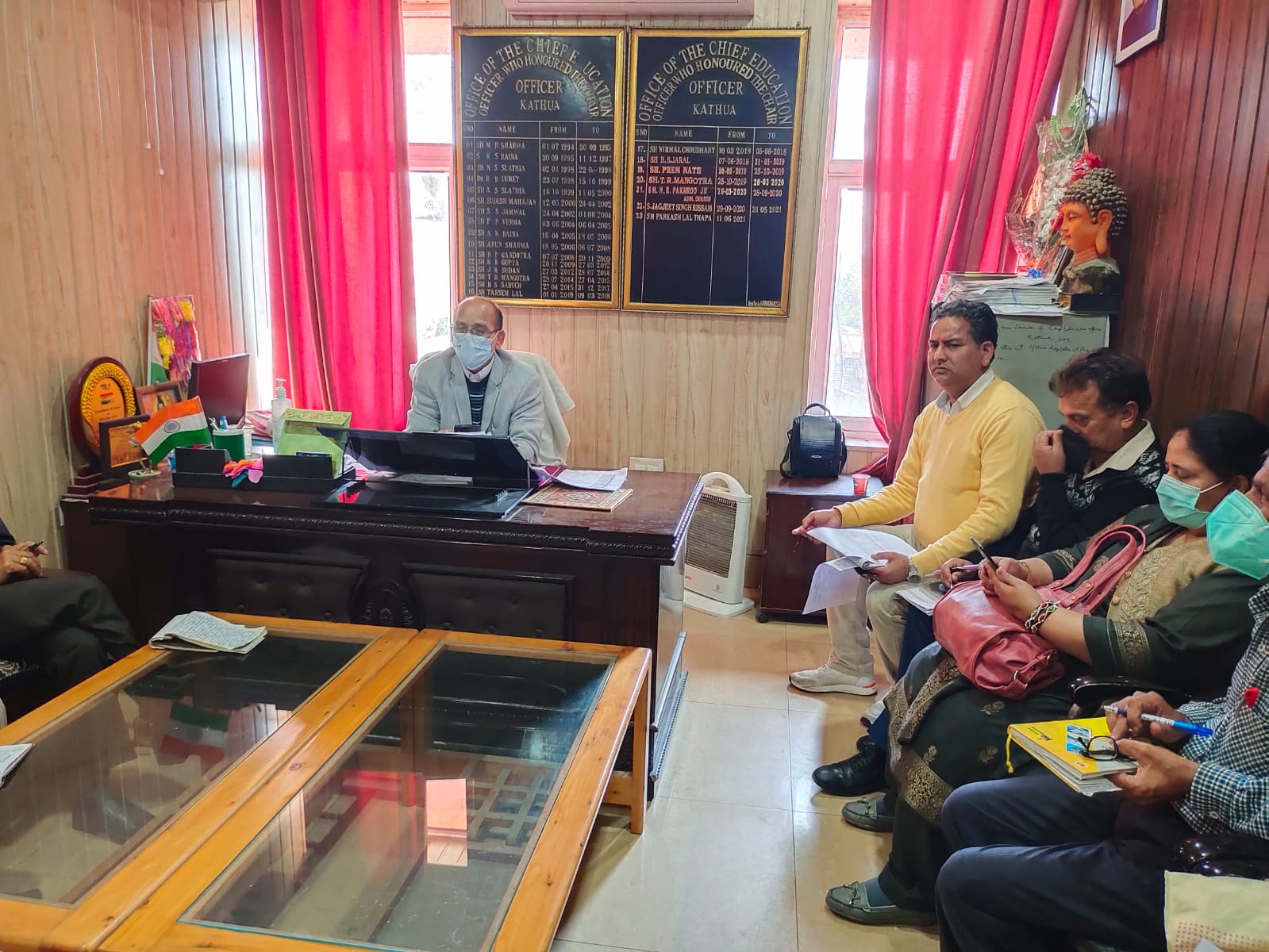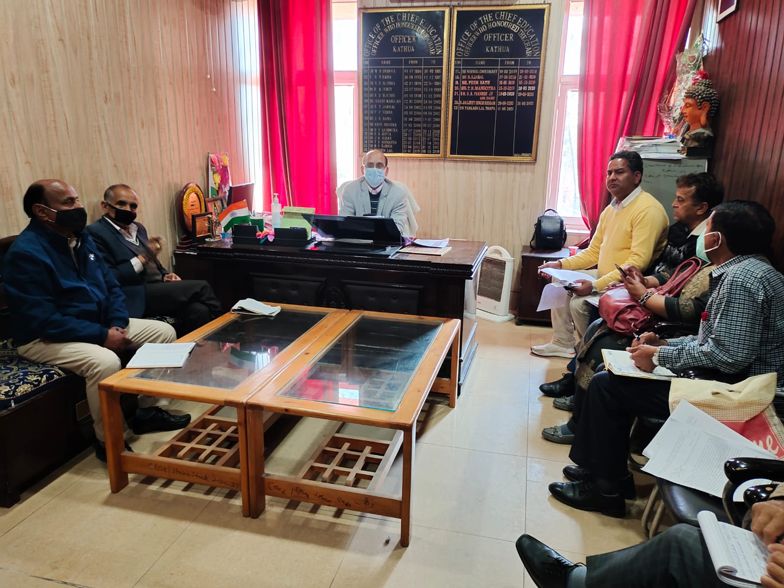 Kathua:  To assess the preparations made for re-opening schools in District Kathua, a meeting was held at the Chief Education Office premises, Kathua which was chaired by Mr. P.L. Thapa, CEO, District Kathua & attended by the Zonal Education Officers of the district.