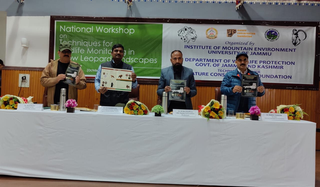 Bhaderwah, October 17 : The eagerly anticipated four days National Workshop on ‘Techniques for Wildlife Monitoring in Snow Leopard Landscapes’ commenced today at Bhaderwah Campus, bringing together wildlife enthusiasts, conservationists, researchers, and managers from different parts of the nation. This workshop being organized by Institute of Mountain Environment in collaboration with Department of Wildlife Protection, Govt. of Jammu and Kashmir from October 17 to 20, 2023, is poised to be a focal event for the advancement of wildlife conservation in snow leopard habitats in the region.It represents a critical milestone in the ongoing effort to bolster conservation initiatives and wildlife monitoring strategies, particularly focusing on the elusive and vulnerable snow leopard and its prey base, said Dr. M.K. Kumar (IFS) Regional Warden, Jammuand Chief Guest of the occasion. He urged the researchers and students to be the brand ambassadors of conservation as the conservation of one species contributes to the protection of many.