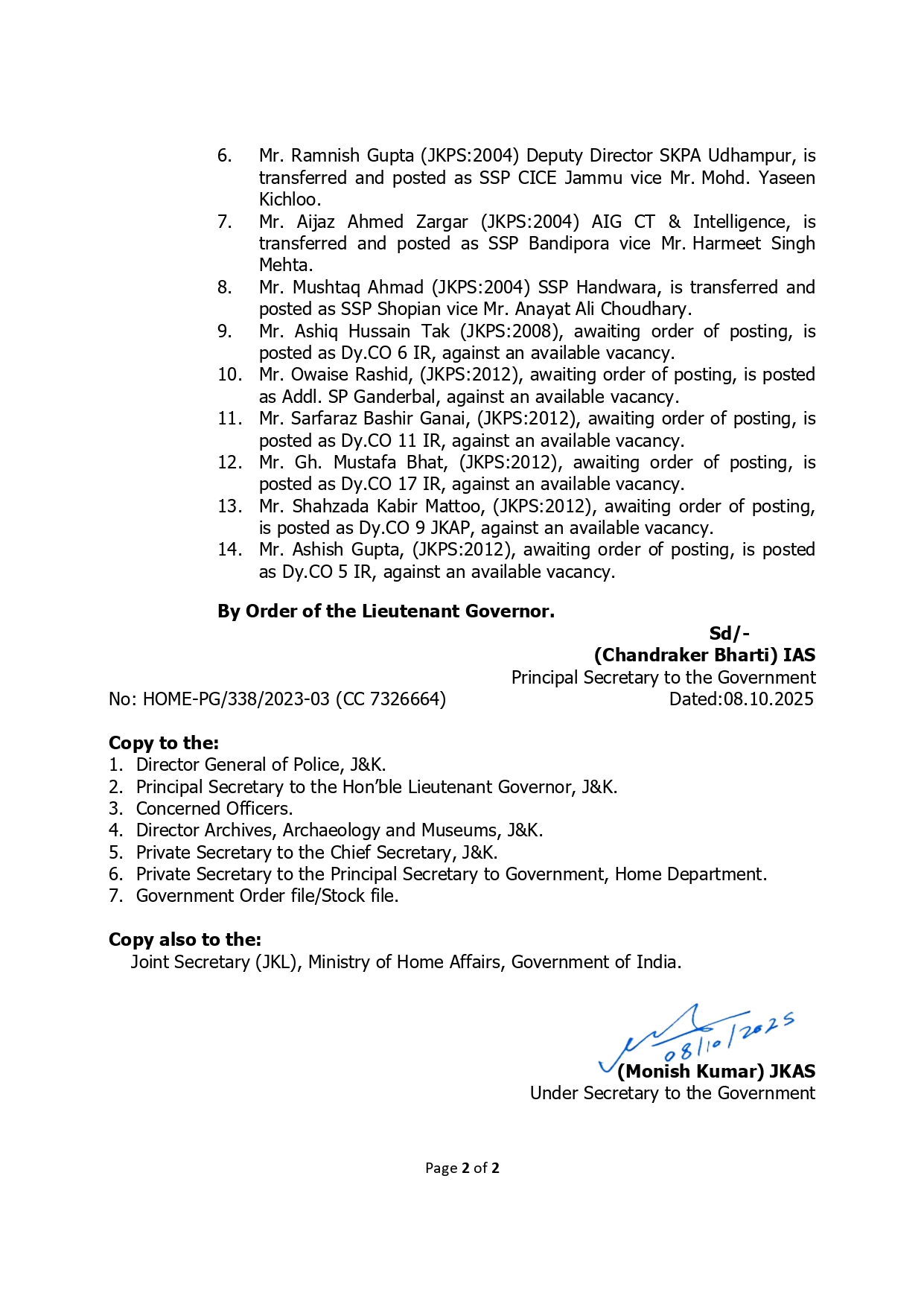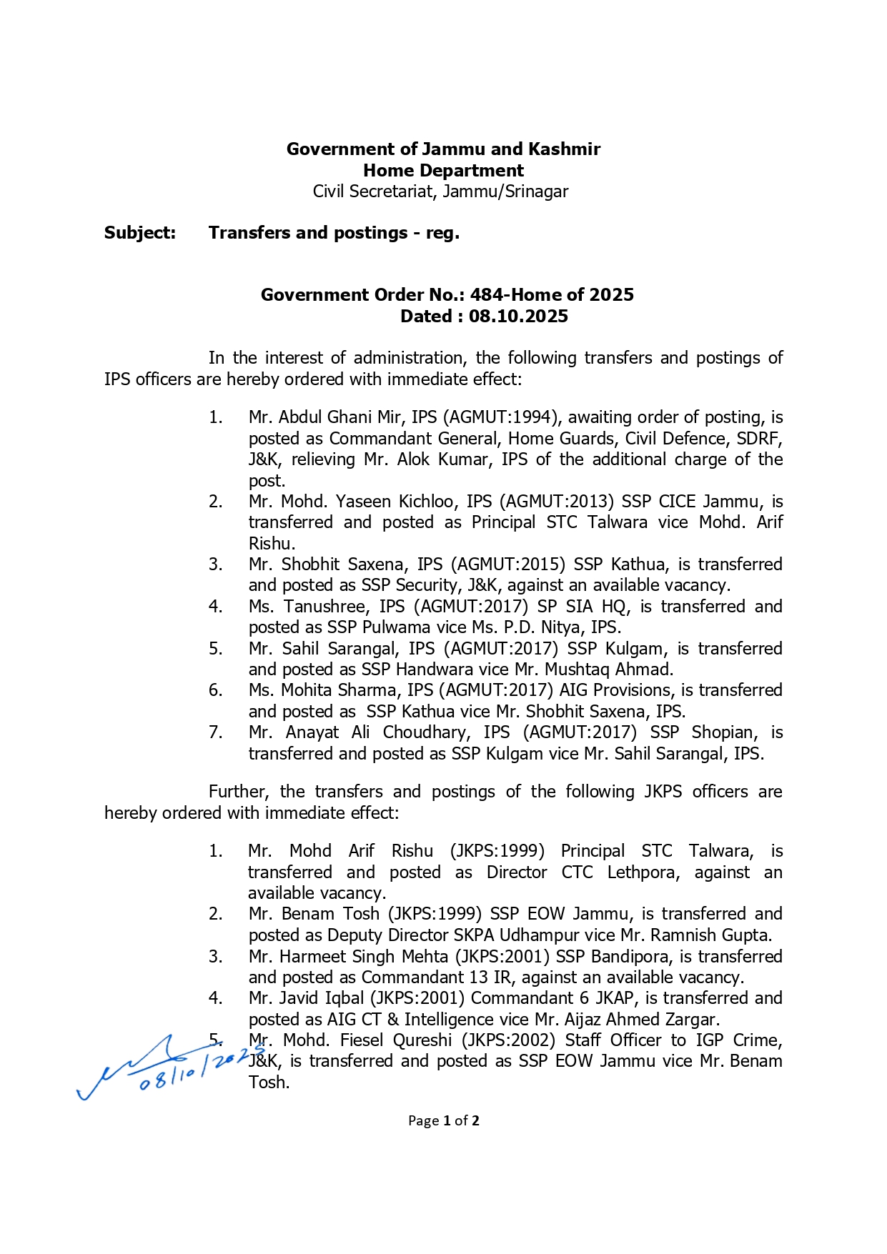 J & K J&K Govt Orders Major IPS, JKPS Reshuffle; Abdul Ghani Mir Appointed Commandant General Home Guards By Paigaam News - October 9, 2025 15 Facebook Twitter Google+ Pinterest WhatsApp