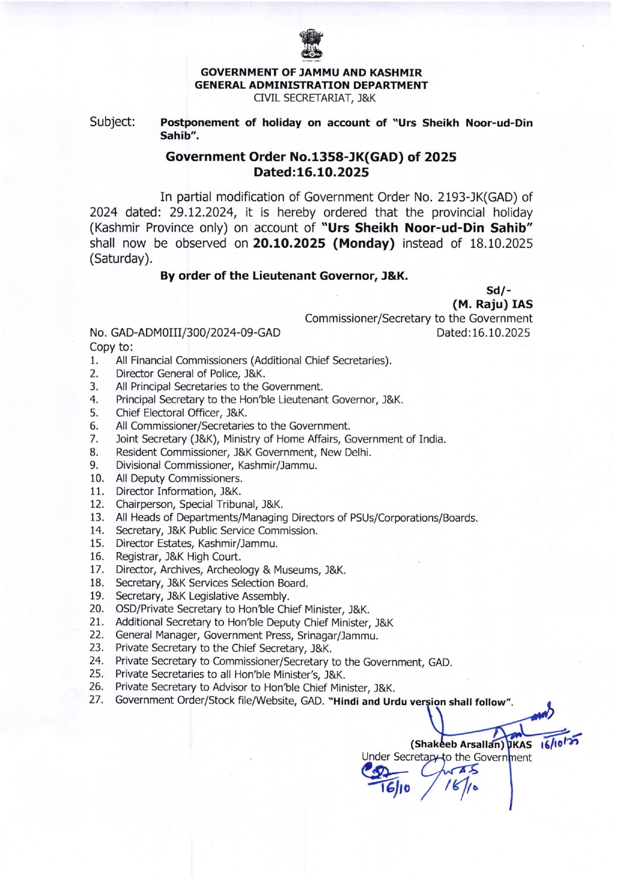 J & K Postponement of holiday on account of “Urs Sheikh Noor-ud-Din Sahib”. By Paigaam News - October 17, 2025 30 Facebook Twitter Google+ Pinterest WhatsApp Photo for representation only.