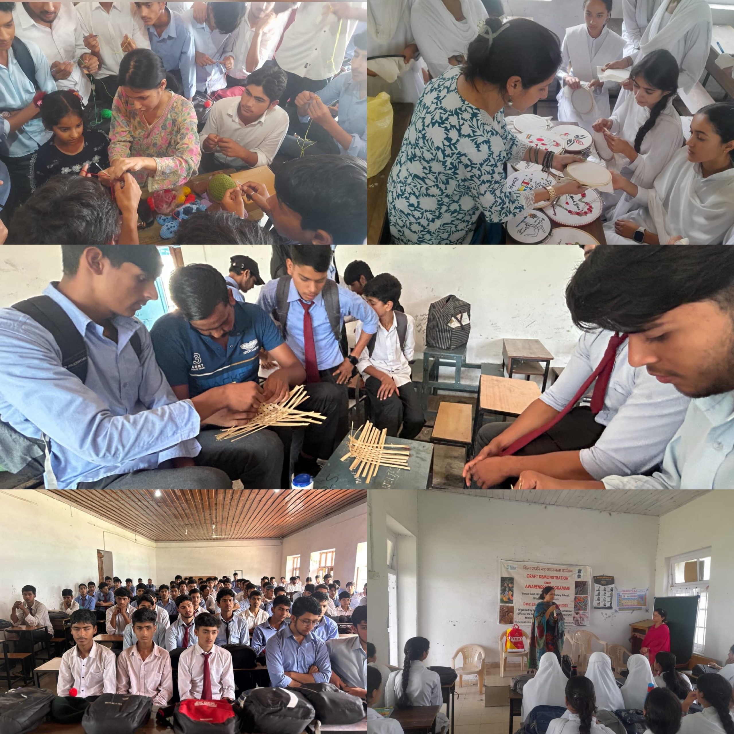 The program featured demonstrations by four accomplished resource persons: Smt. Sona Rupi (State Awardee Basohli Painting), Ms. Sandhya Hans (Embroidery Craft), Mrs. Nasreena (Paper Machie Craft), and Sh. Rajinder Kumar (Bamboo Craft). Students from both schools actively participated, showing significant interest and engagement in learning the foundational techniques of these traditional crafts.